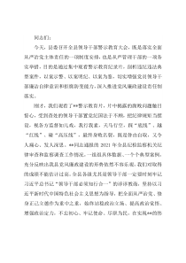 同志们:今天,县委召开全县领导干部警示教育大会,既是落实全面从严治党主体责任的一项制度安排,也是从严管理干部的一项务实举措,目的是通过集中观看警示教育纪录片,剖析违纪违法典型案件,以案示警、以案明纪、以案为
