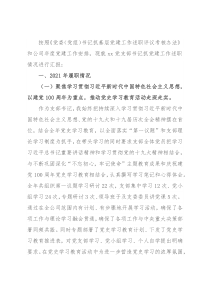 按照《党委(党组)书记抓基层党建工作述职评议考核办法》和公司年度党建工作安排,现就xx党支部书记抓党建工作述职情况进行汇报:一、2021年履职情况(一)聚焦学习贯彻习近平新时代中国特色社会主义思想,以建党100周年为重点,推动党史学习教育活动走深走实。作为支部书记,我始终把持