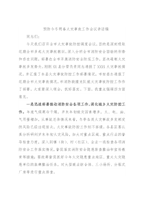 预防今冬明春火灾事故工作会议讲话稿同志们:今天我们召开全市火灾事故防控调度会议,目的是深刻吸取近期全市多起火灾事故教训,深入分析全市消防安全面临的形势和存在问题,部署在全市开展消防安全防范工作,坚决遏制火灾事故多发势头。刚刚XX县分管负责同志通报了XXXX火灾事故情况,并汇报了本