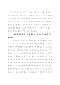 同志们,今天,我们召开X安委会2020年一季度全体会议,主要任务是学习贯彻习近平总书记关于安全生产工作的重要指示批示精神,分析一季度全X安全生产形势,安排部署二季度安全生产工作。刚才,几位副X长都谈了很好的意见,我都赞成,原则同意X安委办、森林防火办和X公安厅、X消防救援