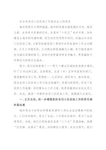有效,现在老旧小区改造工作已经全线铺开,进展比较顺利,形成了良好的工作氛围。但仍需加大工作力度,保质保量按时完成此项工作。在此,就进一步做好老旧小区改造工作,我强调几点意见。一、立足长远,进一步增强抓好老旧小区改造工作的责任感和紧迫感城市是当今世界各种要素