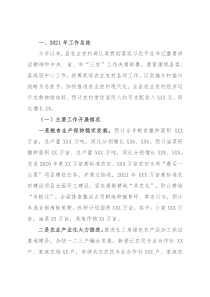一、2021年工作总结今年以来,县农业农村局认真贯彻落实习近平总书记重要讲话精神和中央、省、市“三农”工作决策部署,紧紧围绕县委、县政府中心工作,统筹抓好农业农村各项工作,以实施乡村振兴战略为总抓手,加快推进农业农村现代化,全县农业农村经济运行态势持续