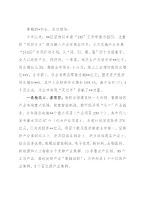 尊敬的*市长、各位领导:今年以来,**区坚持以市委“136”工作举措为指引,注重把“项目为王”理念融入产业发展各环节,大力实施产业发展“25425”专项行动计划,从“谋、引、建、服”四个方面着手,全力以赴抓产业、稳经济。一季度,地区生产总值完成**亿元,同比增长5.2%,增