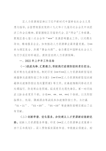 区竞合、共建“黄金内湾”,奋力建设中国特色社会主义先行示范区标杆城区,提供坚实的人力资源保障。一、2022年上半年工作总结(一)战疫先锋、汇聚微力,积极践行疫情防控的责任担当。筑牢常态化疫情防线。制定印发《**市**区人力资源局新型冠状病毒肺炎疫情防控工作方案》《**市**区人力资源局新
