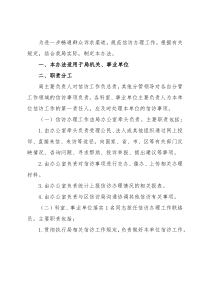 单位信访工作。2.承办局办公室交办的本科室、单位有权受理的信访事项,负责信访答复内容、信访交办件的相关报告及重复件治理相关材料等。3.按时向局办公室报送转办信访事项的办理情况。4.及时报送重大、紧急或突发信访事项和信访信息,在职责范围内依法、及时采取措施,防止不良影响的产生、