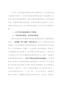 推动了各项工作有序稳步开展。一、上半年党风廉政建设工作情况(一)强化政治建设,筑牢政治根基部机关党委始终坚持把党的政治建设摆在首位,旗帜鲜明讲政治。一是增强“两个维护”的政治定力。深入开展政治机关意识教育、对党忠诚教育和革命传统教育,通过组织观看《历史虚无主义与苏联解体》专题片、红色电影《跨过